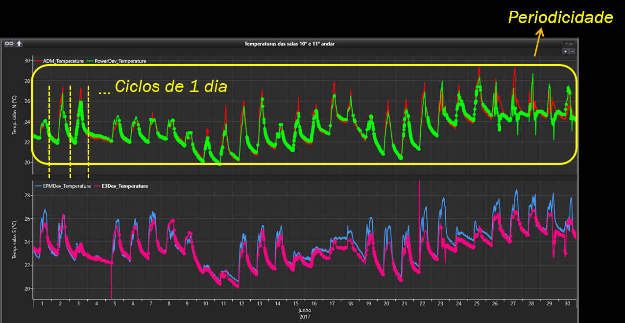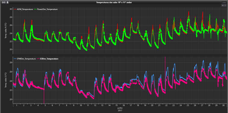 Criar um gráfico com as temperaturas médias diárias das salas na ala sul da Elipse Software - RS (10° e 11° andares EPMDev_Temperature / E3Dev_Temperature) do mês de junho de 2017.
